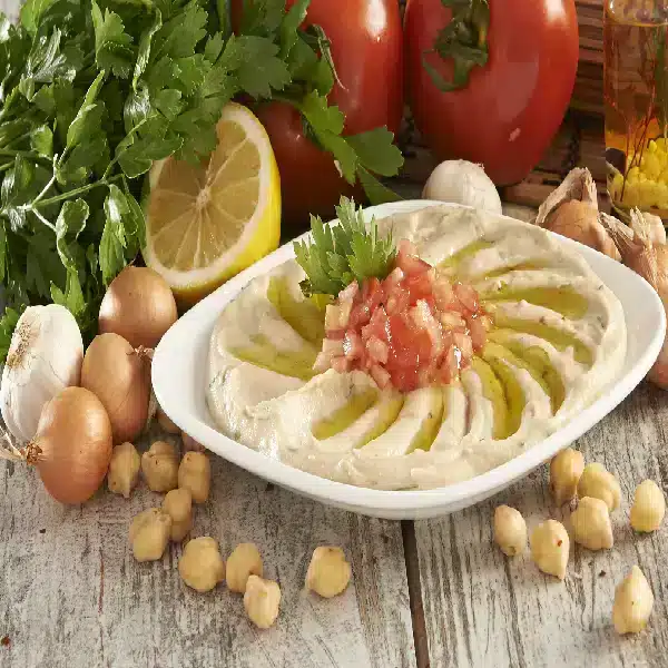 In some variations, diced tomatoes, onions, and cucumber are added to the hummus for extra texture and flavour. Hummus Beyruti is usually served as a dip with pita bread, crackers, or vegetables and is a popular appetizer or snack in Middle Eastern cuisine.
